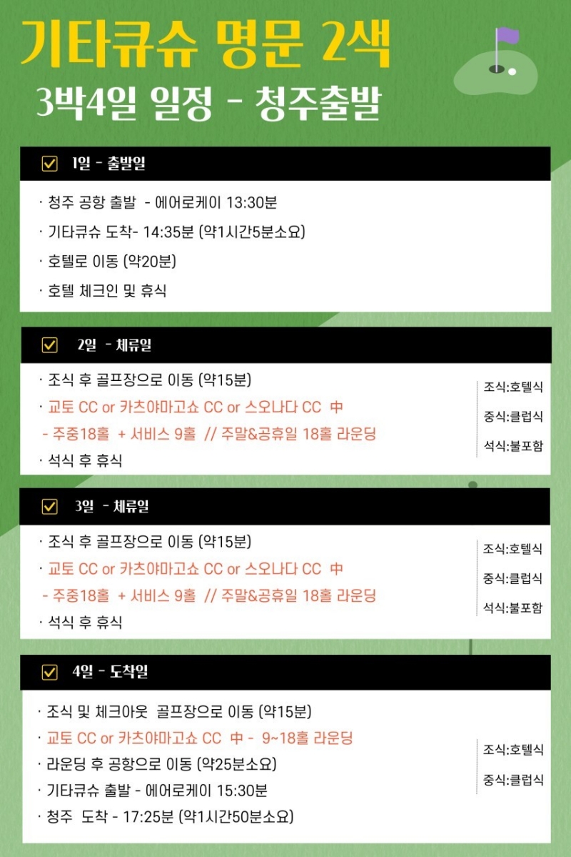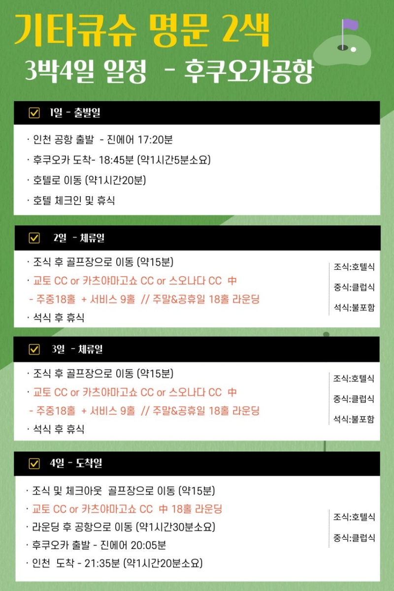 기타안내사항 1. 각 차시별 호텔상이>개별파일 참조 2. 호텔별 트윈룸or 싱글룸 배정(금액동일) 3. 한국인담당자 4. 해발 600~1000M 후지산 품격 골프장 3곳 5. 호텔주변 후지시 시내 자유여행 6. 카트 페어웨이진입 가능/ 단, 현장상황에따라 변동 (날씨및 잔디컨디션에따른 조치)