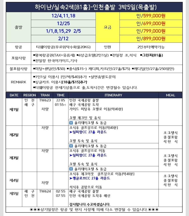 ▶4성급호텔(2인1실기준) ▶그린피 ▶조,석식 ▶한국어 가이드,기사